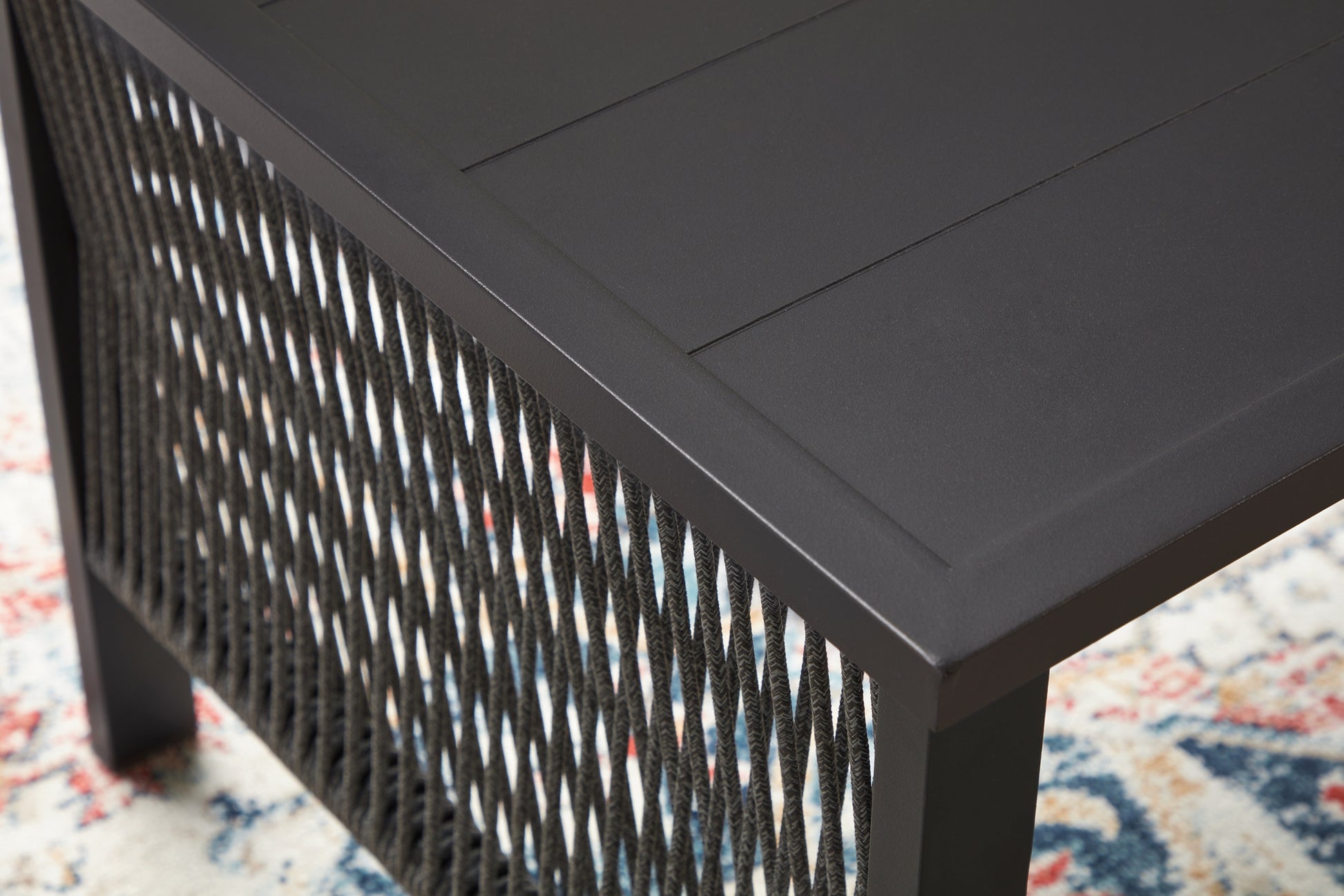 Details Includes loveseat, 2 lounge chairs and coffee table, Rust-resistant aluminum frame with durable powder coated finish, Powder coated aluminum resists rusting and fading, Polyester rope, Foam cushion core wrapped in soft polyester for a low-maintenance, comfortable cushion, Solution-dyed high-performance fabric, Nuvella® is an outdoor fabric that can be cleaned and offers enhanced UV resistance, Clean fabric with mild soap and water, let air dry; for stubborn stains, use a solution of 4 oz. bleach to 28 oz. water, Stainless steel hardware resists rust and boosts longevity, Designed to withstand the harsh elements of the outdoors, 2 throw pillows included, Assembly required