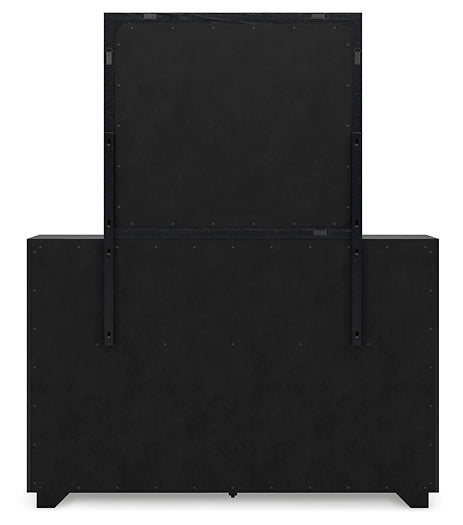 Details | Includes dresser and mirror, Made with pine solids, veneers and engineered wood substrate, Textured black wood stain with waxy topcoat, Hardware-less design, 6 drawers with fully finished interiors, dovetail construction and ball-bearing side glides (top drawers felt lined), Mirror attaches to back of dresser | |