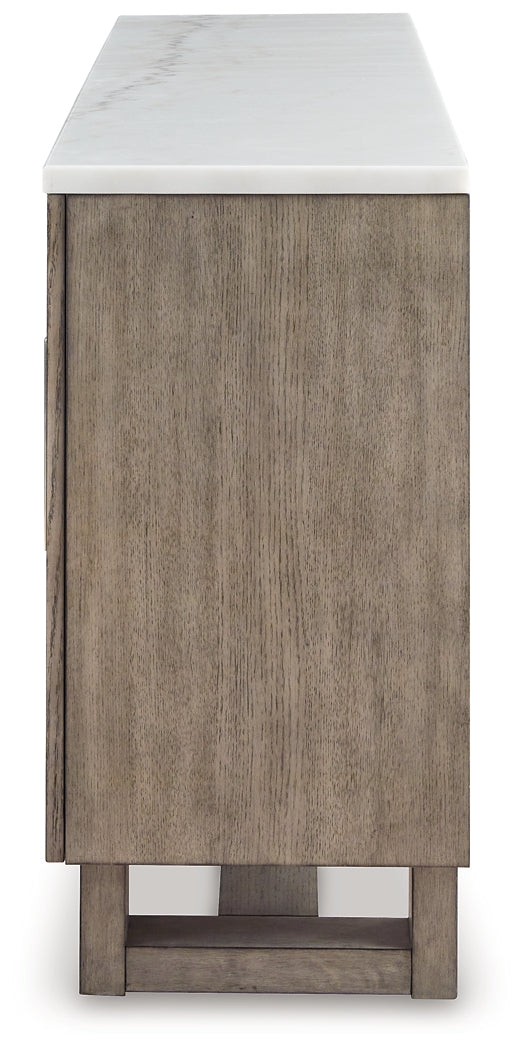 Welcome casual, contemporary style and functionality to your home. This TV stand delivers a mixed-material vibe with its white marble top and grayish brown finish, lending a laid-back look that’s so welcome at the end of a long day. Cabinet doors with framed chevron accents and large silvertone pulls add dimension and style. And there’s plenty of room to store entertainment accessories, with adjustable shelving and cord management holes for added convenience and versatility.